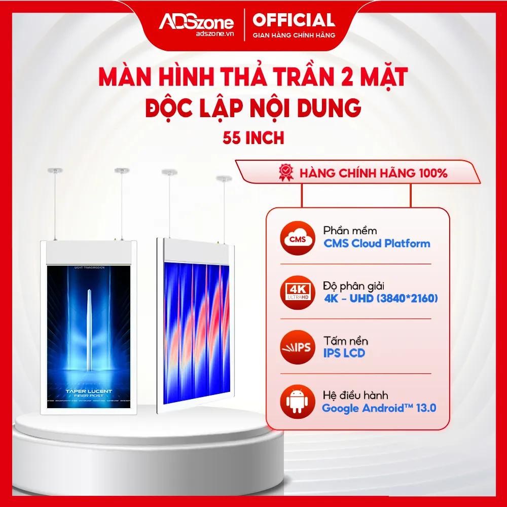 Màn hình quảng cáo thả trần 2 mặt độc lập mang đến giải pháp hiển thị hai chiều, lý tưởng cho những không gian muốn truyền tải nhiều nội dung khác nhau đến nhiều hướng người xem. Với thiết kế treo gọn gàng, sản phẩm vừa tiết kiệm diện tích vừa tạo hiệu ứng hiển thị nổi bật, đặc biệt phù hợp cho trung tâm thương mại, sảnh tòa nhà.