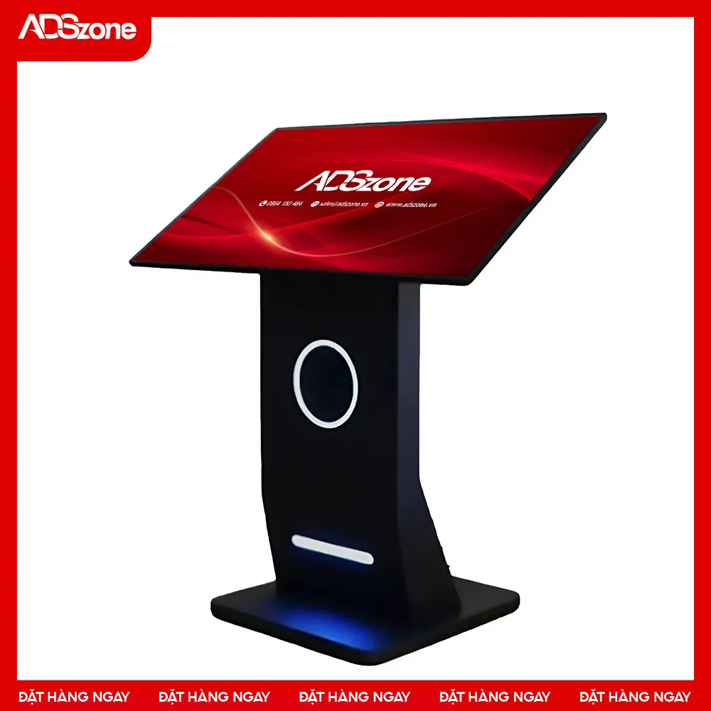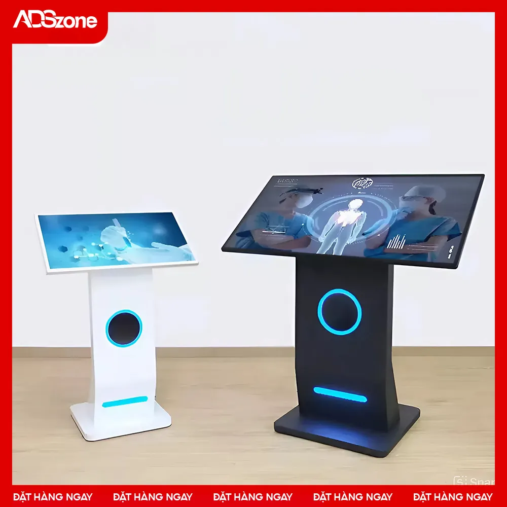 Phần chân đế được tạo hình uốn cong mềm mại theo dáng chữ I, phá vỡ cảm giác vuông vức, cứng nhắc thường thấy ở các dòng màn hình cảm ứng truyền thống. Điểm nhấn nằm ở đèn LED vòng tích hợp tại thân đế, giúp thiết bị luôn nổi bật trong sảnh lớn, không gian rộng hoặc khu vực có nhiều nguồn sáng phức tạp, dễ dàng thu hút ánh nhìn ngay từ xa.