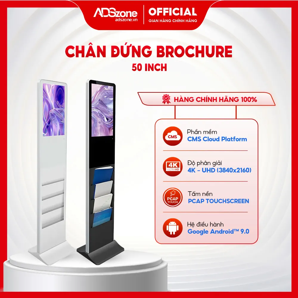 Màn hình chân đứng brochure 50 inch là thiết bị hiển thị nội dung số chuyên dụng, được thiết kế để thay thế hoàn toàn brochure giấy, poster in ấn và standee truyền thống. Với kích thước lớn hơn, độ phân giải UHD 4K sắc nét cùng khả năng quản lý nội dung linh hoạt, sản phẩm giúp doanh nghiệp truyền tải thông tin rõ ràng, trực quan và đồng bộ hình ảnh thương hiệu trong mọi không gian tiếp xúc khách hàng.