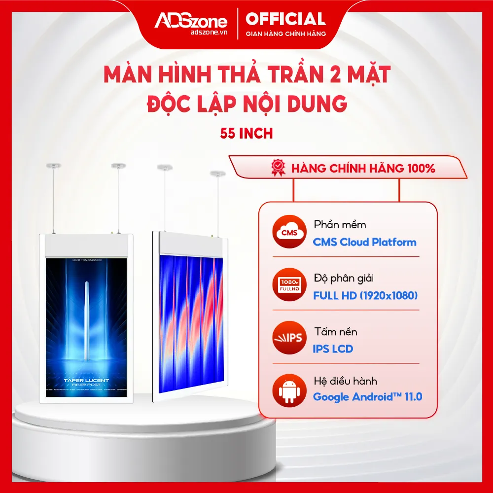 Màn hình quảng cáo thả trần 2 mặt độc lập mang đến giải pháp hiển thị hai chiều, lý tưởng cho những không gian muốn truyền tải nhiều nội dung khác nhau đến nhiều hướng người xem. Với thiết kế treo gọn gàng, sản phẩm vừa tiết kiệm diện tích vừa tạo hiệu ứng hiển thị nổi bật, đặc biệt phù hợp cho trung tâm thương mại, sảnh tòa nhà.