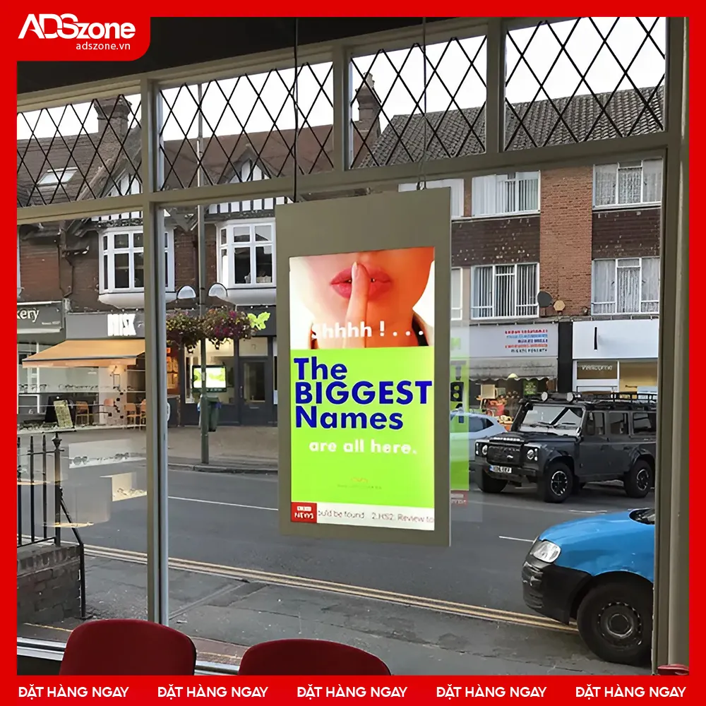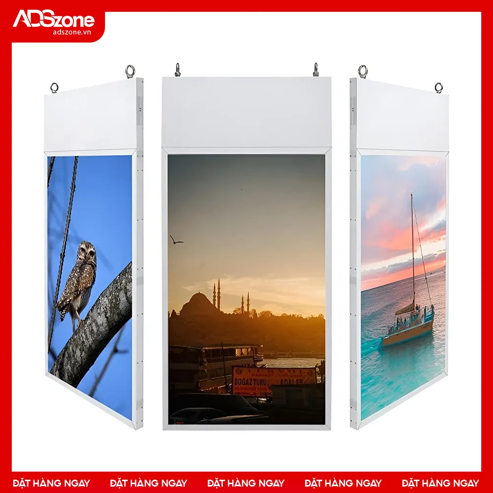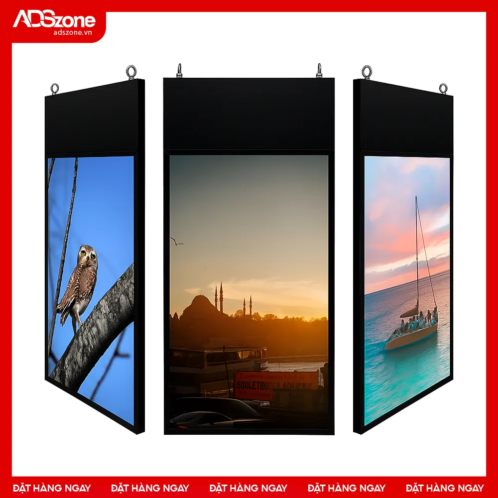Màn hình quảng cáo thả trần 2 mặt giúp truyền tải nội dung nhất quán từ nhiều hướng, tạo điểm nhấn thu hút tại các không gian đông người như trung tâm thương mại hay sảnh tòa nhà.